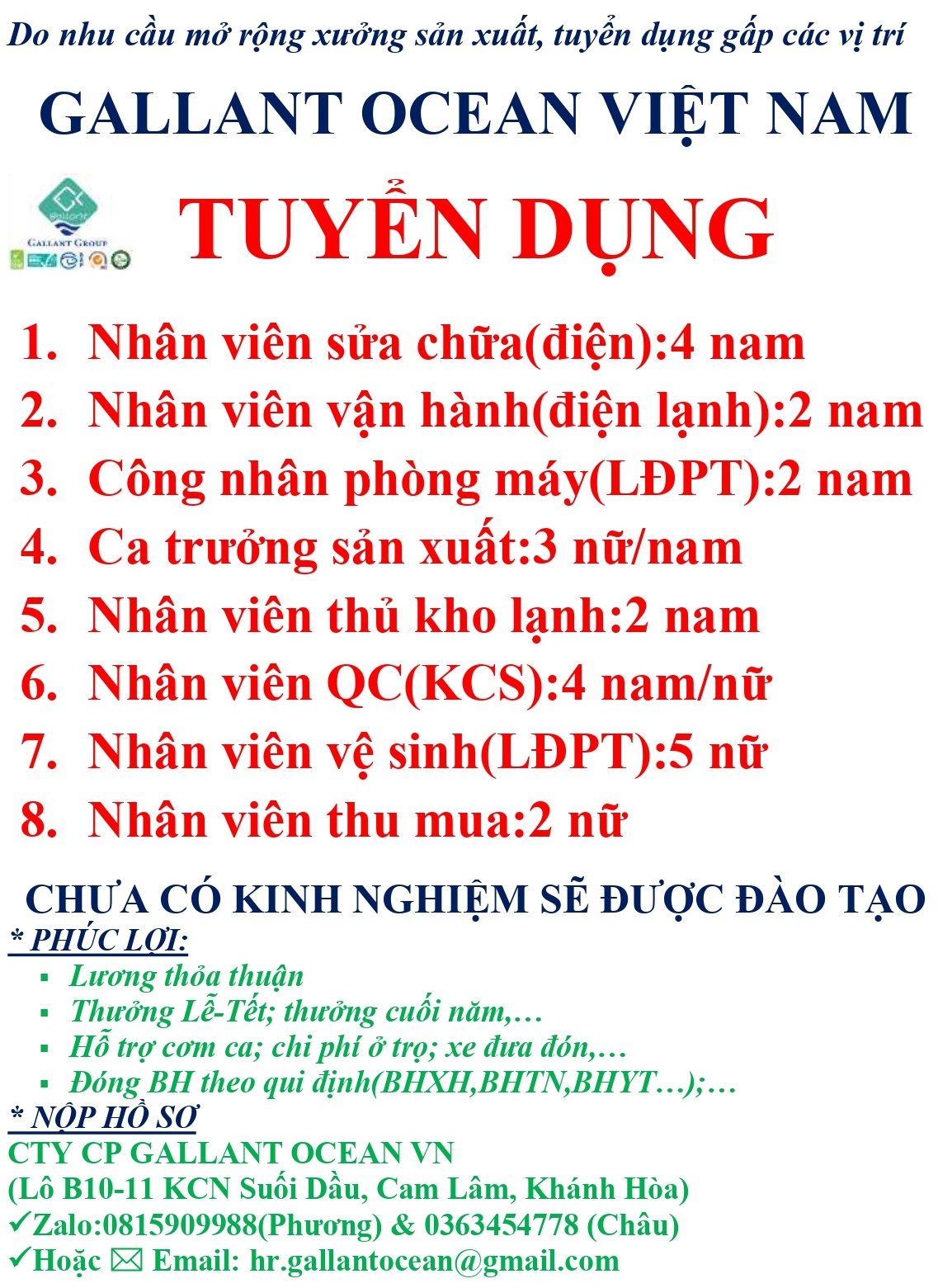 THÔNG BÁO TUYỂN DỤNG CỦA CÔNG TY CP GALLANT OCEAN VN